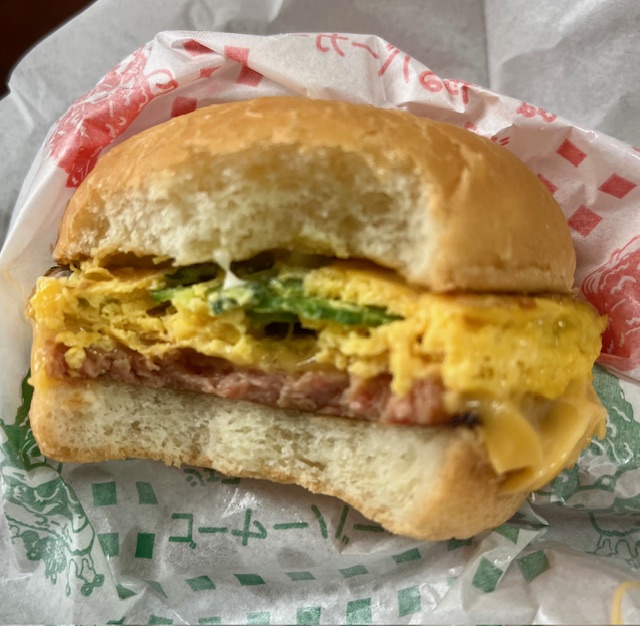 - ポーク(ランチョンミート):厚切りのポークがジューシーで食べ応え抜群。