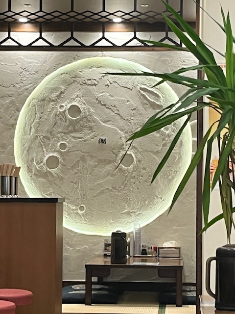 最も目を引くのは、店舗の奥にある巨大な「月」のオブジェです。