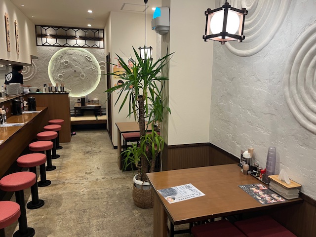 • 幻想的なライティング: 壁面に浮かび上がる月が優しく店内を照らし、まるで夜の静寂の中で食事をしているような、落ち着いた大人の雰囲気を演出しています。