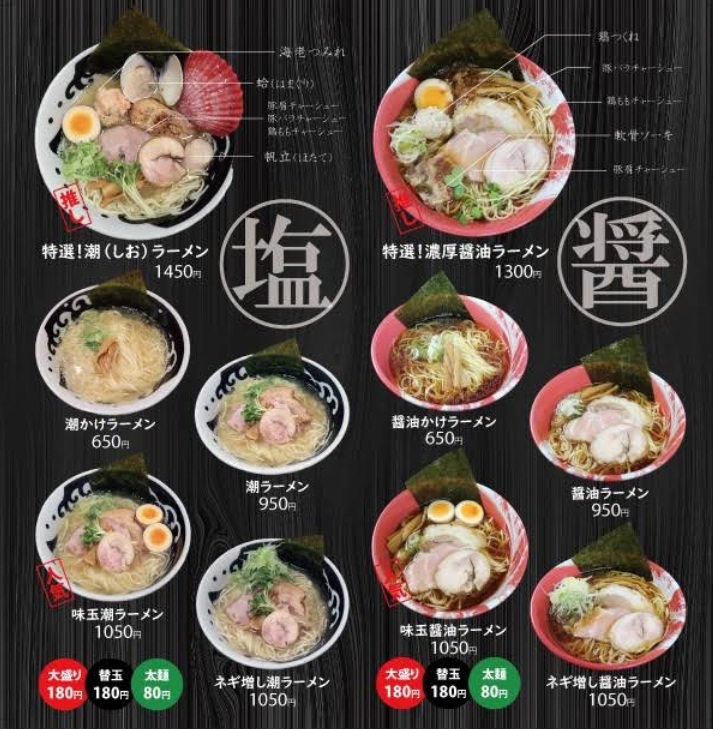 「ラーメン潮」のメニューを開くと、まず目に飛び込んでくるのが「県産若鶏の鶏ガラをベースに帆立や貝類を合わせた清湯スープ」というこだわりの案内です。今回は、その真髄を味わうべく「醤油」と「塩」の2種類をいただきました。